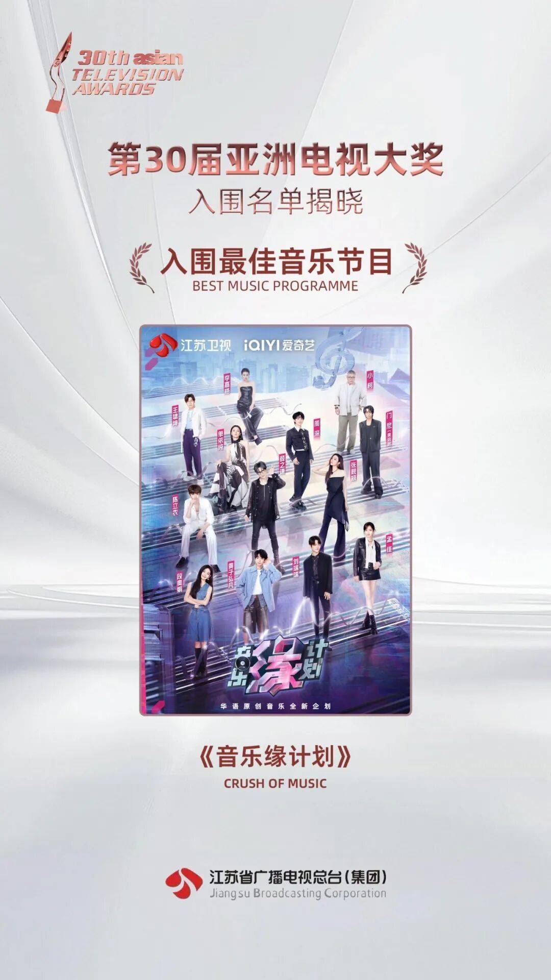 喜报!江苏卫视《音乐缘计划》《小小骑士一起冲》入围第30届亚洲电视大奖